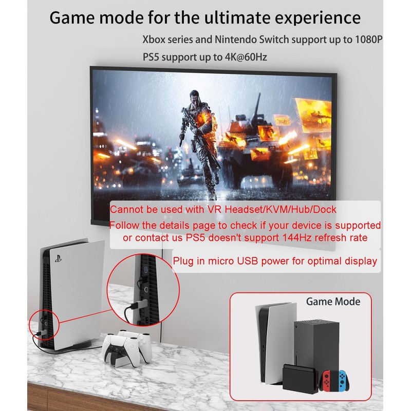 • Wide CompatibilityThe hdmi to display adapter is perfectly suited to all HDMI input devices and DP Monitors devices. Compatible with PC, desktop, computer, XBox 360, XBox One, PS4/ PS5, MacBook Pro 2015, Mac Mini etc. Support DisplayPort 1.4b/ 1.2a, HDCP 2.2/ 1.3/ 1.4, HDMI 2.0 and HBR2 (High-Bit-Rate 2), which can delivers crystal high definition images. For Xbox series and Nintendo Switch support 1080P only, PS5 support up to 4K@60Hz.