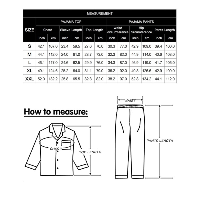 - SIZE NOTE: Please choose the men's sleepwear according to our size chart and your figure data. Please do not only compare the size title (S/M/ L/ XL/XXL) with your usual clothing, please read carefully each element of the size guide (bust, waist, length, etc.)