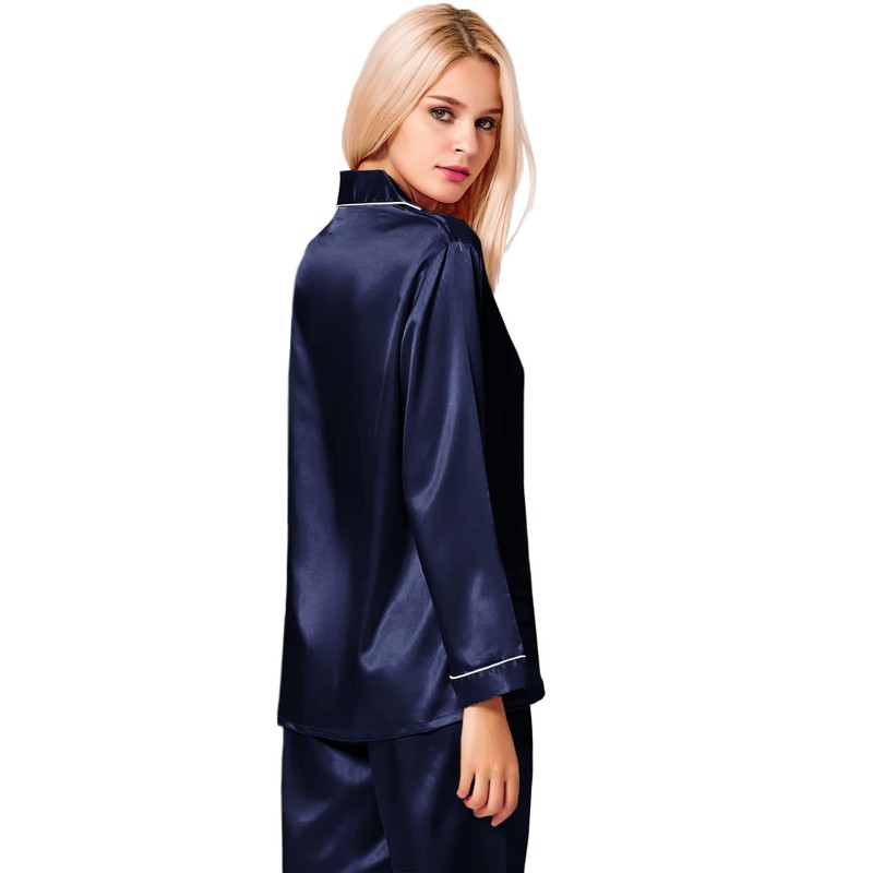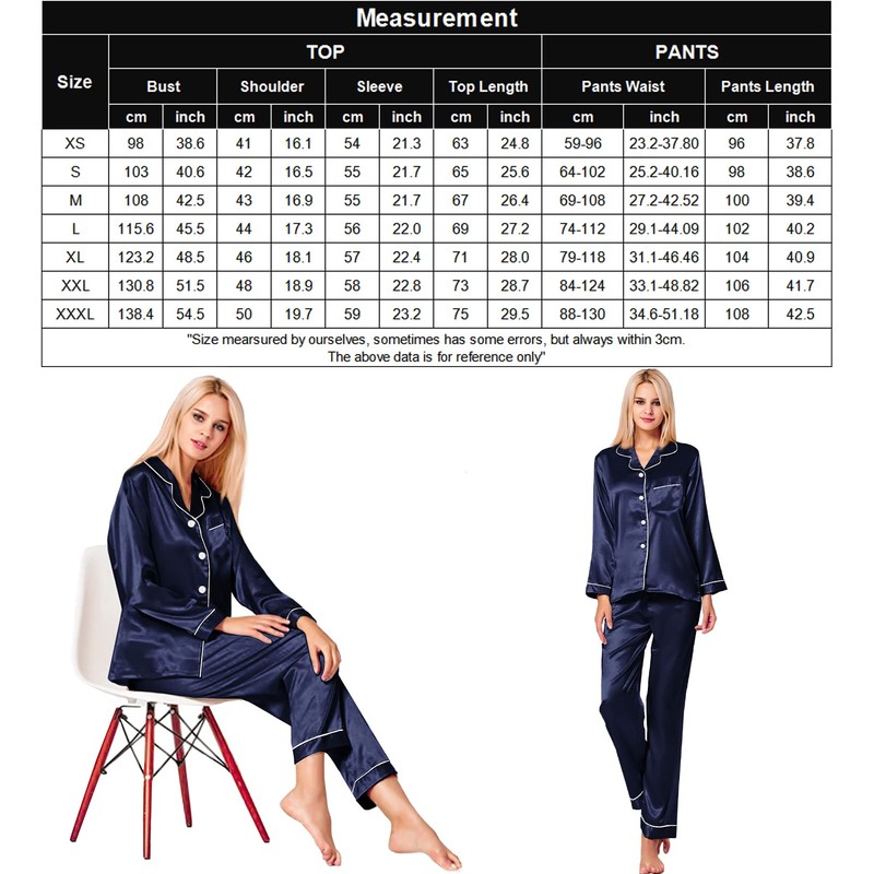 - Features: The two-piece comfortable women's loose-fit sleepwear pyjama set has the silkiest trousers with an elastic waistband and goes with a silky smooth long sleeve V-neck with chest pocket, stand-up collar and a buttoned top section at the hips. The satin sleepwear sets are soft and elegant so you can sleep well.