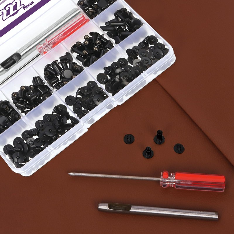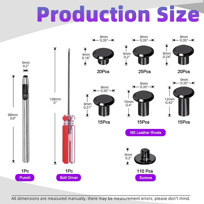 - 👛 What You Get ------ In this kit, You will get 110 Set 6 Sizes Leather Rivets Chicago Binding Screws with Install Tools Assortment Kit, Including 20 Sets M5x4mm Chicago screws; 25 Sets M5x5mm Chicago screws; 20 Sets M5x6mm Chicago screws; 15 Sets M5x8mm Chicago screws; 15 Sets M5x10mm Chicago screws; 15 Sets M5x12mm Chicago screws; 1Pcs screwdriver; 1Pcs punch. Intotal 110 Sets Chicago Binding Screws with Matched Screws can meet all your daily needs.