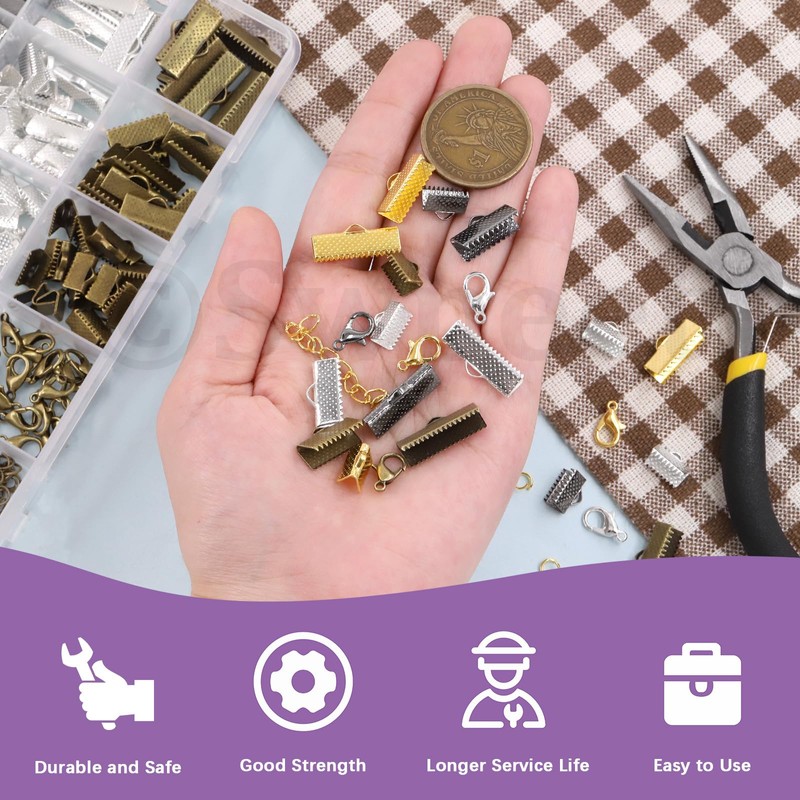 - 💥【Ribbon End Crimps】------ These ribbon end crimps are made of high quality metal alloy, not easy to fade, rust or deform. They can match with any designs, lightweight, sturdy and durable enough for long time use. Each ribbon clamp have a flat hook on the top, it’s smooth without burr, safe to use, easy for you to make any pendants through the hook. And each ribbon end clamp has teeth design for better grip to secure on different material.