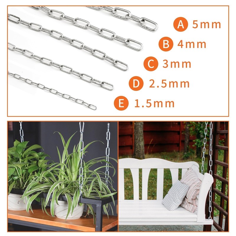 - Wide Application: SWTYExt 304 Stainless steel chain has versatile applications, serving as a swing chain, clothesline, pet chain, anti-theft chain, garbage bin chain, awning chain, ground anchor chain, lifting chain, fence chain, and more. Padlock chain ideal for hanging accessories in gardens, homes, gyms, or playgrounds.