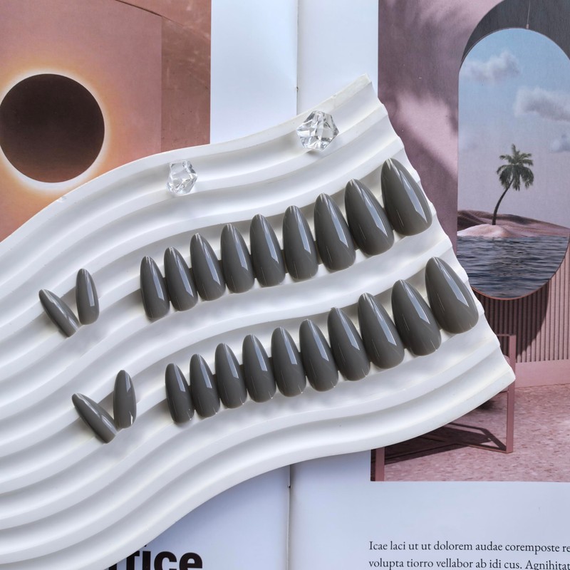 - All-In-One Kit, No Guesswork: Get 24 gray false nails medium length in 12 sizes for a custom fit every time. Comes with nail glue, adhesive tabs, nail file, cuticle stick, alcohol pad. Everything you need for a perfect grey fake nails almond mani in one box