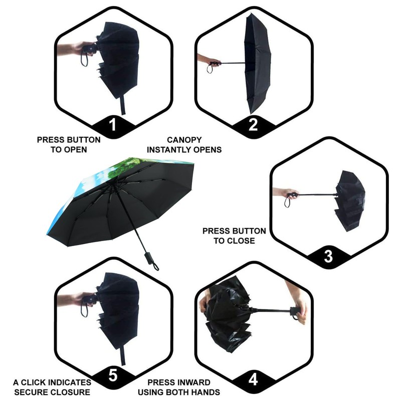 - Fully Automatic Umbrella: Auto open and close umbrella can handy for quick entry into a car, building or tent. You can quickly open or close the travel umbrella at the press of a button