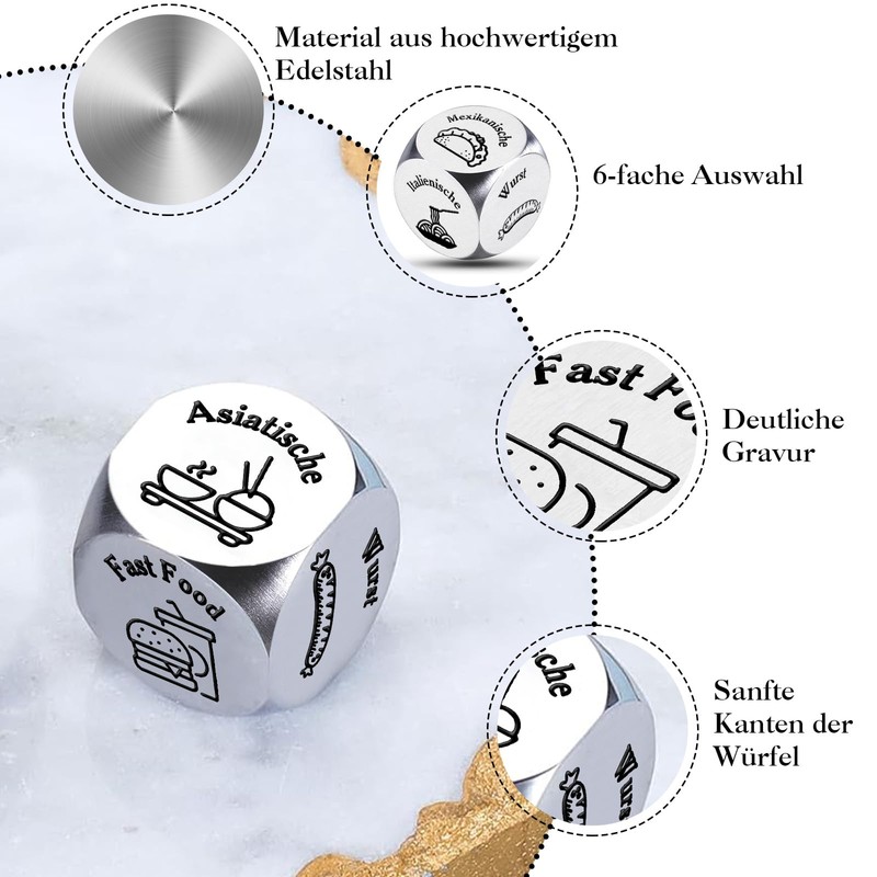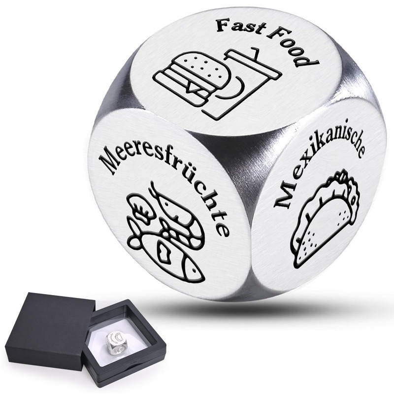 • High quality: our date night cubes are made of high quality stainless steel, lightweight, durable and portable. The smooth, rounded corners of the food decision cubes enhance their aesthetics and provide a comfortable grip on these exciting cubes. Engraved words and patterns are not only clear and easy to read, but also less prone to wear and tear. Perfect as a small surprise for women and men, Christmas gift, anniversary gift for him or her or Valentine's Day gift for boyfriend and girlfriend.