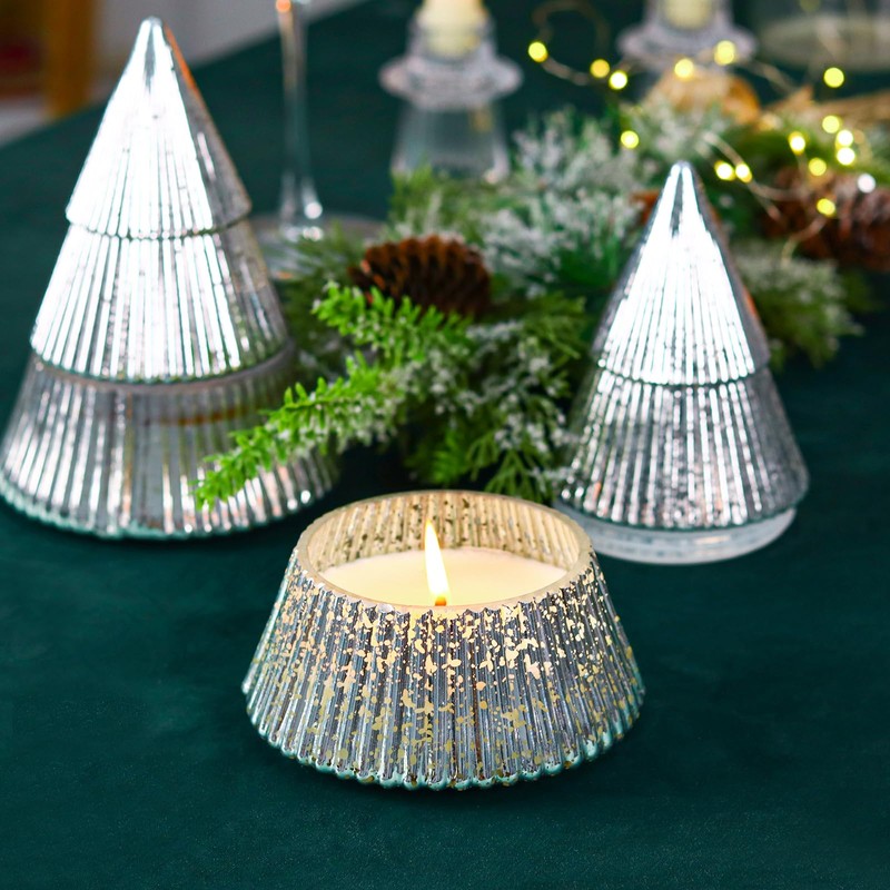 - Unique Christmas Tree Candle Design: Our decorative Christmas candle stands out with its elegant silver mercury glass tree design, serving as both a stunning holiday decor piece and a luxurious home fragrance solution. The glass tree top doubles as a scented lid, enhancing its charm and practicality. Perfect for indoor and outdoor holiday decor, this candle brings a touch of festive spirit wherever it's displayed