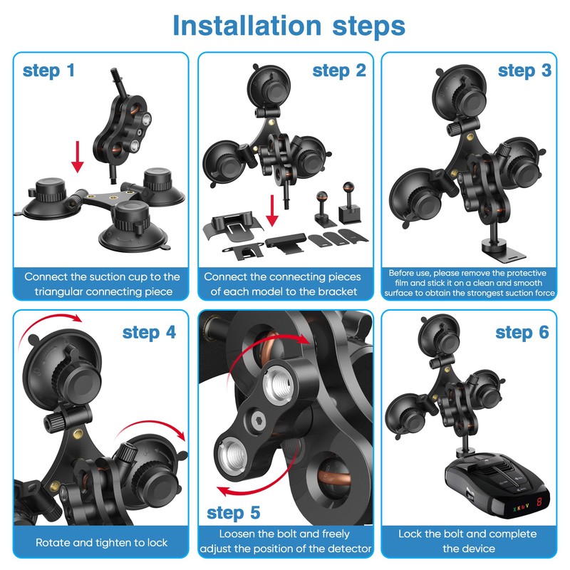 • MULTI FUNCTIONAL USE The triangular suction cup holder has strong scalability and can be connected to any rotating ball adapter with a diameter of 0.63 inches at the ball head. The triangular connector and handle bolt of the radar detector suction cup bracket have 1/4 threaded ports for easy expansion of different devices