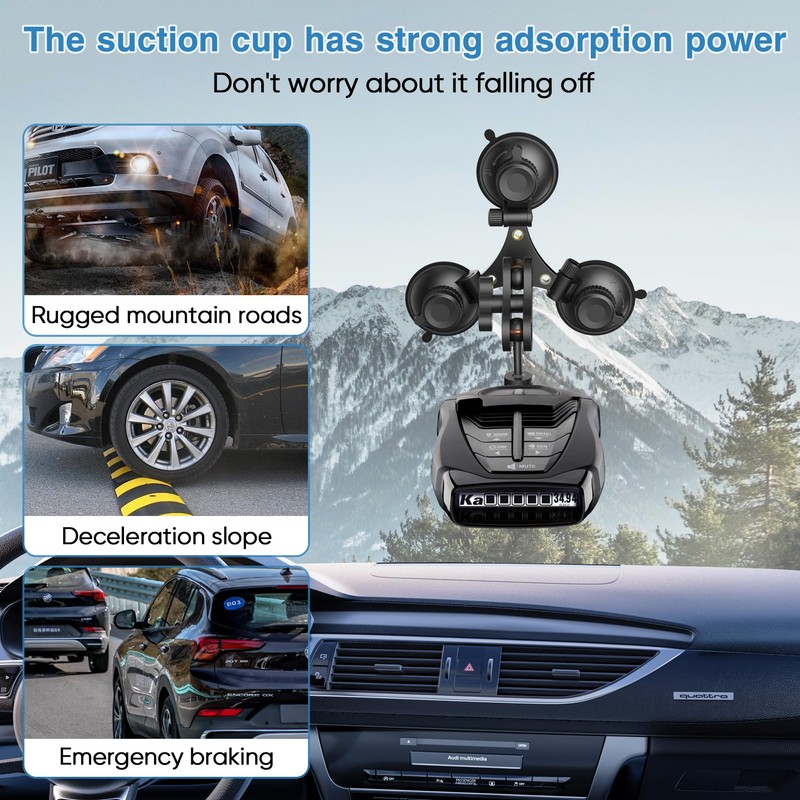 • HIGH QUALITY BRACKET Say goodbye to plastic brackets that are prone to falling off when exposed to high temperatures. Our triangular suction cup car mounted radar bracket is made of all aluminum alloy and has undergone anodizing treatment to improve corrosion resistance and wear resistance. No matter on rugged mountain roads, deceleration slopes, or sudden braking, there will be no shaking during driving, ensuring safety and stability without worrying about falling off