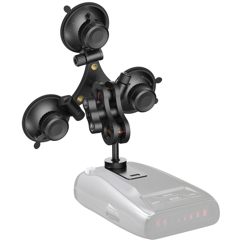 - MULTI FUNCTIONAL USE The triangular suction cup holder has strong scalability and can be connected to any rotating ball adapter with a diameter of 0.63 inches at the ball head. The triangular connector and handle bolt of the radar detector suction cup bracket have 1/4 threaded ports for easy expansion of different devices