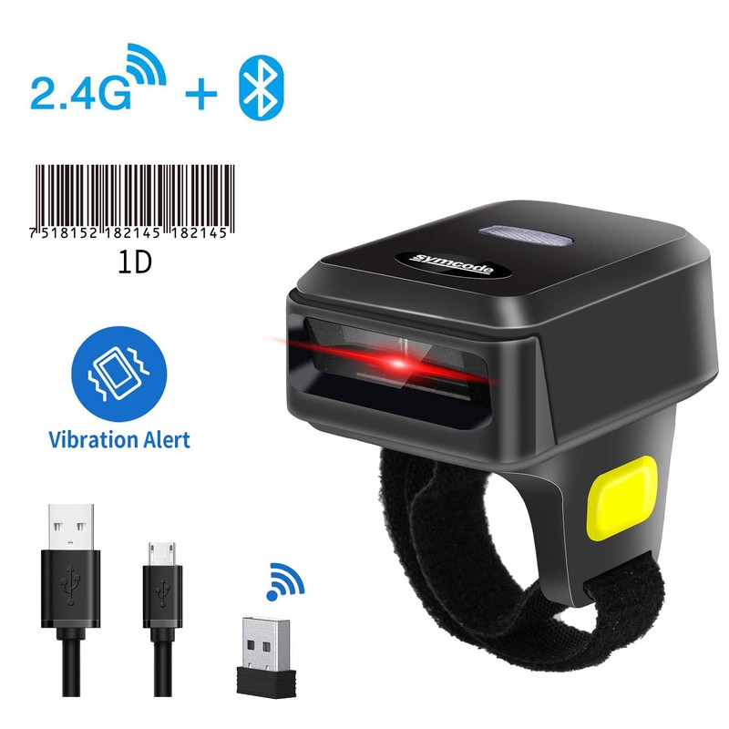 symcode Symcode Wireless Bluetooth Barcode Scanner with Bluetooth & 2.4GHz Wireless & Wired Connection, Portable Ring Wearable Finger 1D Mini Bar Code Reader Scanner