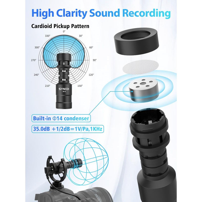 - Easy and quick installation: SYNCO external video microphone Mic-M1S is powered from your device, and adopts plug and play and no button design. The silicone shock mount with a 1/4" thread is ready to attach the microphone to camera, gimbal, tripod, boom rod or stand