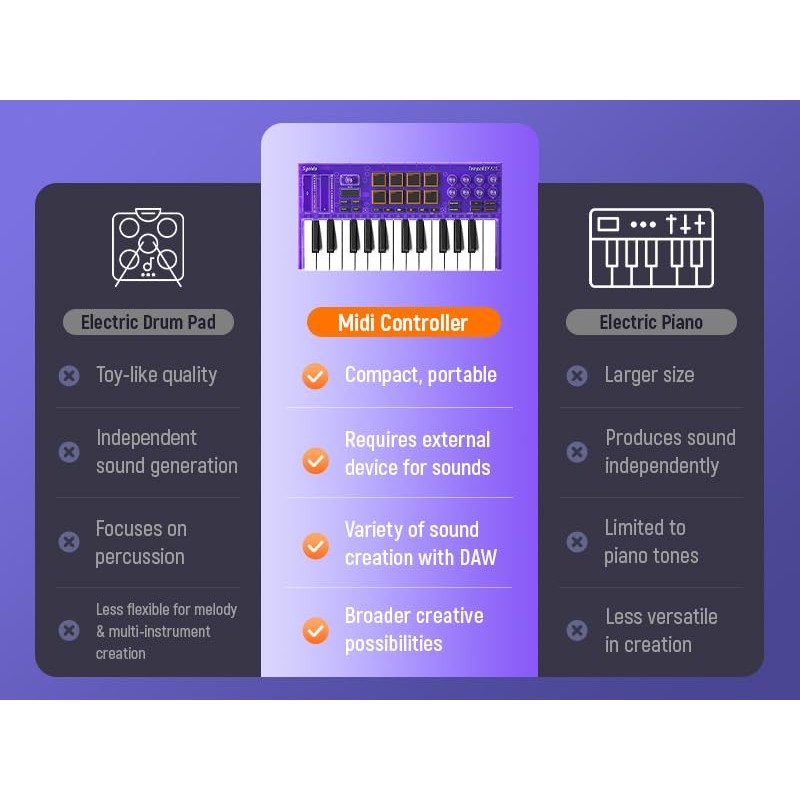 - ✔️[IMPORTANT: NO SOUND, NOT a Piano/Drum] It won’t make sound on its own. This is a MIDI controller, not a standalone keyboard. You need to connect it to a computer or phone and use music software (like GarageBand or Ableton) to make music. Think of it like a remote control for your music software—it helps you play notes, control sounds, and create music.