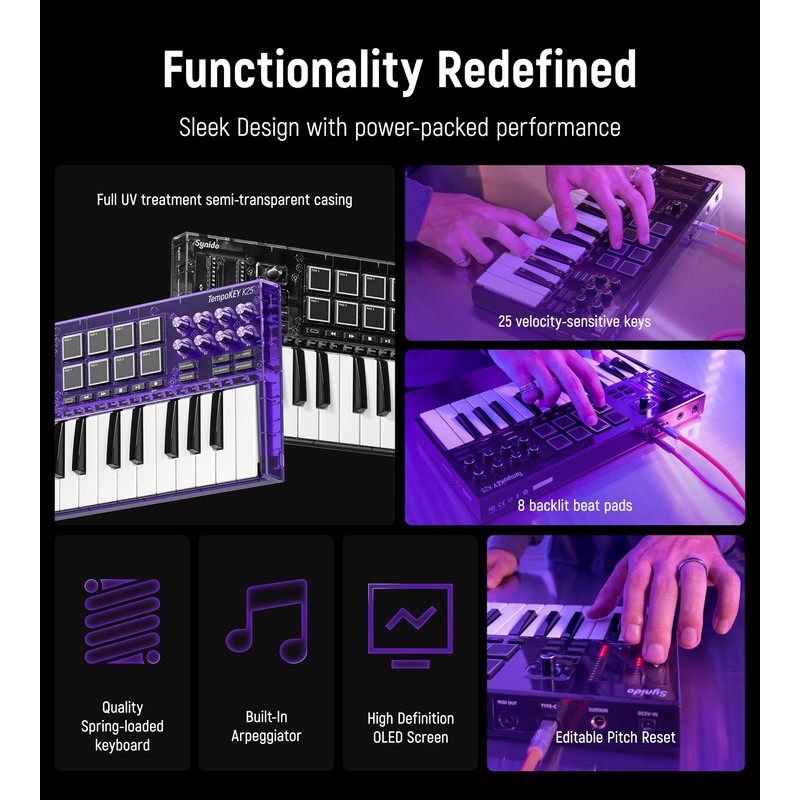 Synido USB C MIDI Keyboard Controller 25 Keys with 8 Backlit Drum Pads, OLED Screen, Compact Mini MIDI Controller for Music Production – Black, TempoKEY K25