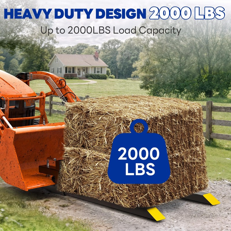 - Heavy-Duty 2000 LB Capacity: Designed to safely handle 2000 lbs when loads are centered deep on the pallet forks. Always calculate total weight (equipment + load) to stay within your loader’s capacity for secure operation. Ideal for farms, warehouses, and construction sites.