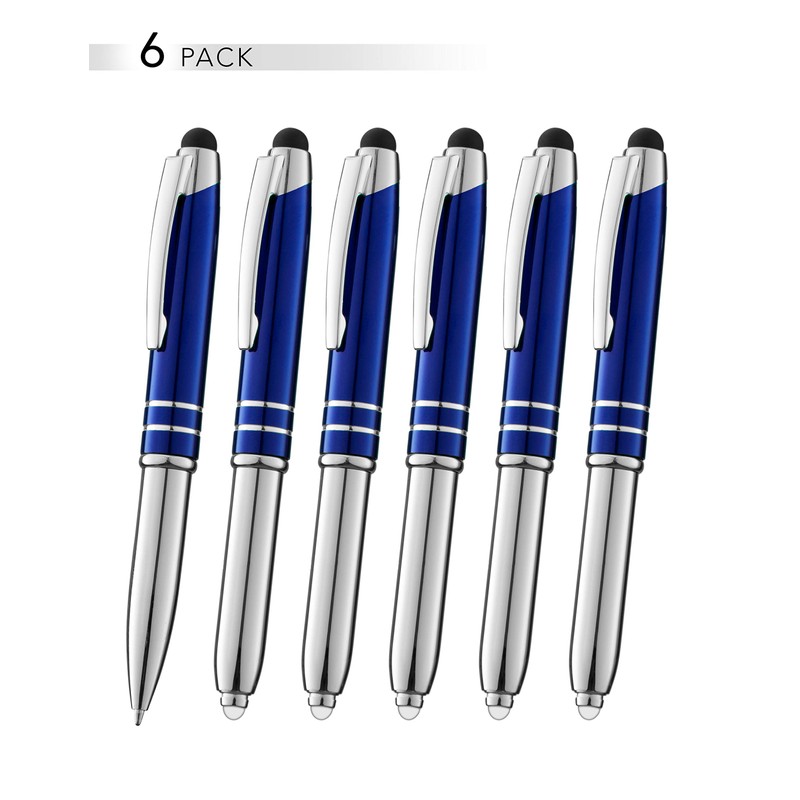 SyPen Stylus Pen for Touchscreen Devices, Tablets, iPads, iPhones, Multi-Function Capacitive Pen with LED Flashlight, Ballpoint Ink Pen, 3-in-1 Metal Pen, 6PK, Black Ink, Blue Barrel