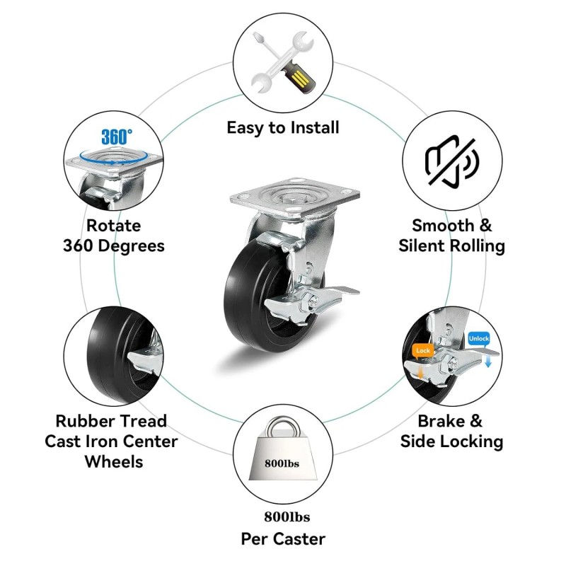 - 【HIGH RESISTANCE】Industrial caster wheels have soft rubber tires molded onto iron centers. Soft rubber provides more desirable operating characteristics than any other wheel material. It is quiet, absorbs shock .The Rubber Caster wheel is a very attractive all-purpose wheel which is versatile and stylish.