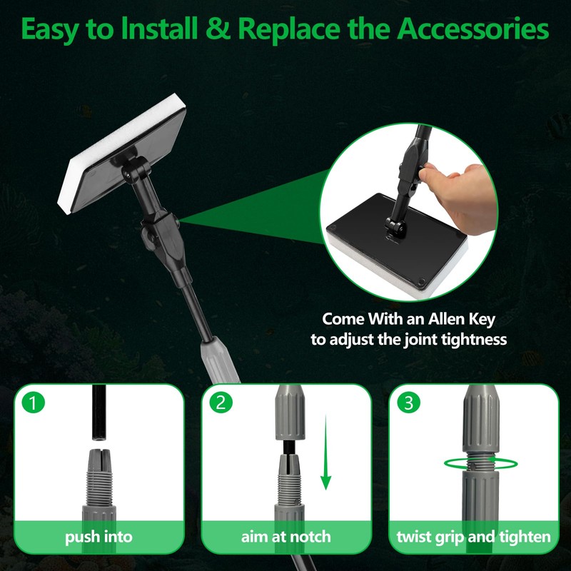 - 【Packing Include】1 x right angle sponge cleaner, 1 x fish net, 1 x flat sponge cleaner, 1 x tube brush, 1 x gravel rake, 1 x metal blade, 4 x sponge