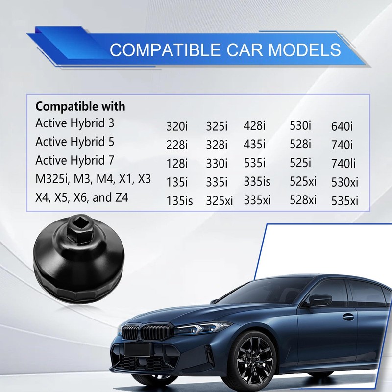 - Compatible With BM: Oil filter wrench is compatible with BM128i, 135i, 135is, 228i, 320i, 325i, 325xi, 328i, 330i, 335i, 335is, 335xi, 428i, 435i, 525i, 525xi, 528i, 528xi, 530i, 530xi, 535i, 535xi, 640i, 740i, 740li, Active Hybrid 3, Active Hybrid 5, Active Hybrid 7, M325i, M3, M4, X1, X3, X4, X5, X6, and Z4. Please verify the style your vehicle uses before ordering