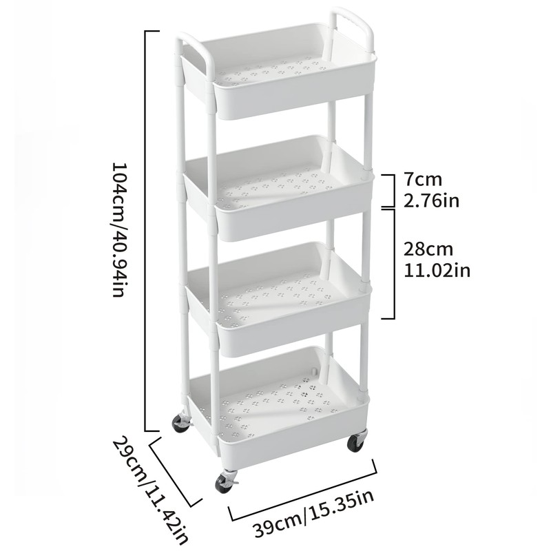 Sywhitta 4-Tier Plastic Rolling Utility Cart with Handle, Multi-Functional Storage Trolley for Office, Living Room, Kitchen, Movable Storage Organizer with Wheels, White