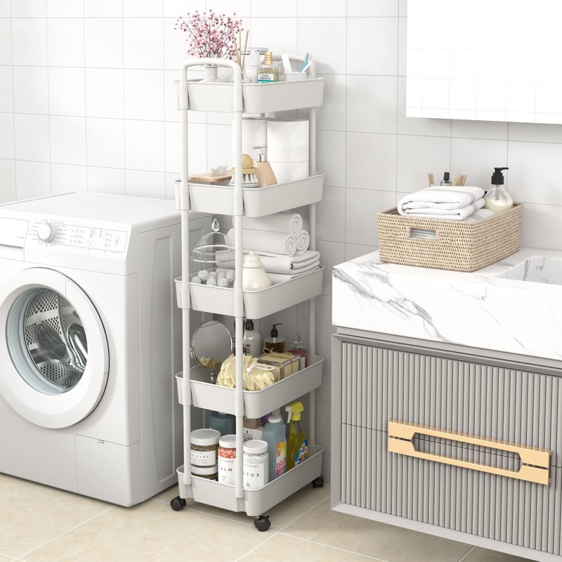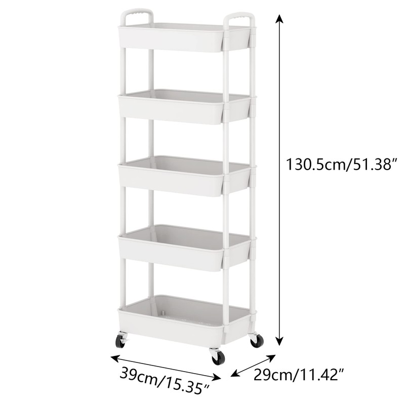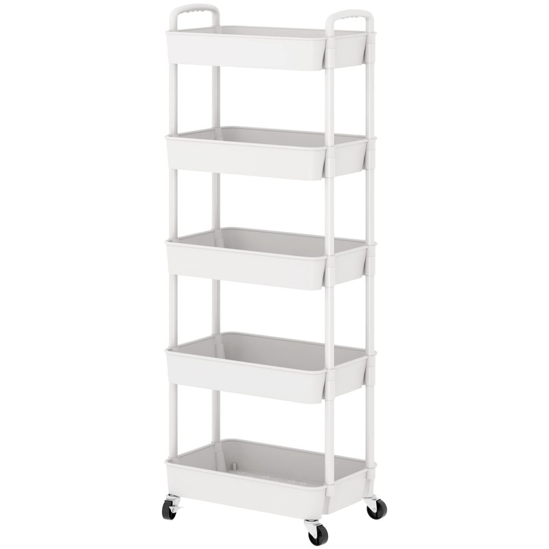 Sywhitta 5-Tier Plastic Rolling Utility Cart with Handle, Multi-Functional Storage Trolley for Office, Living Room, Kitchen, Movable Storage Organizer with Wheels, White