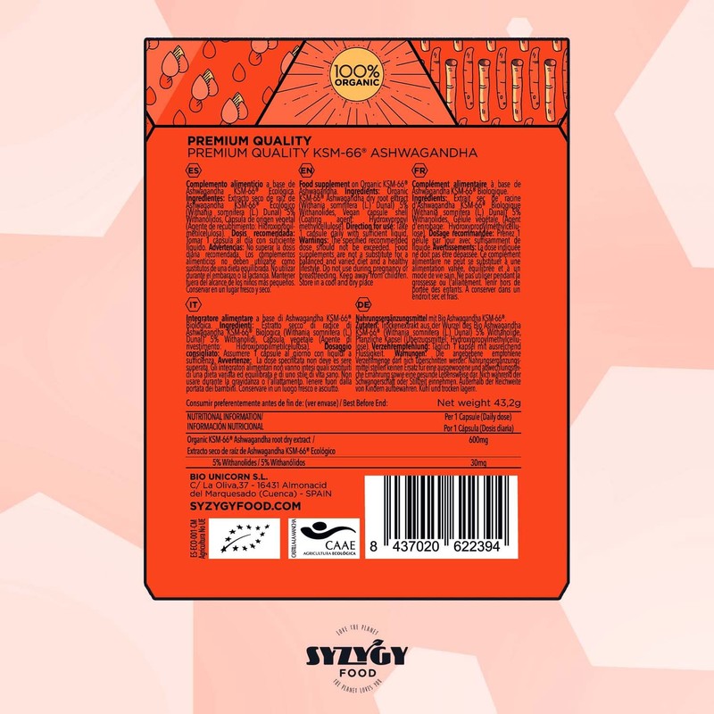 - It is 100% ashwagandha KSM-66 and organic. Suitable for vegans and vegetarians. Syzygy Food's 100% organic ashwagandha comes from India and is made in Spain. An ideal supplement for a vegan or vegetarian diet. It contains no magnesium stearate, silicon dioxide or other additives.