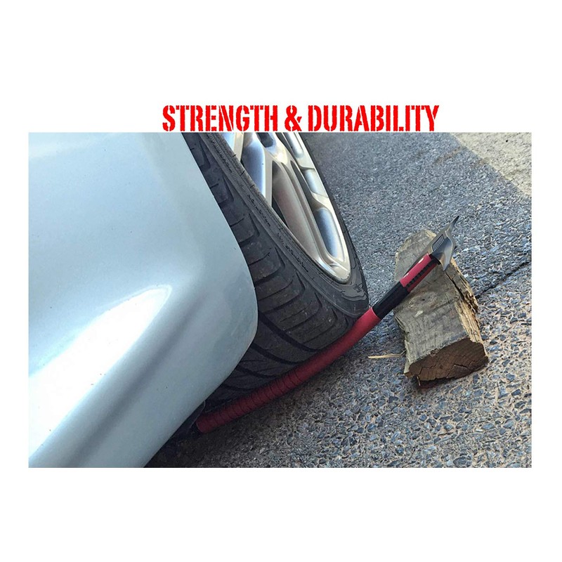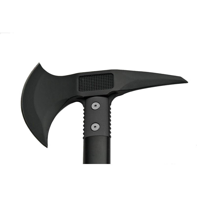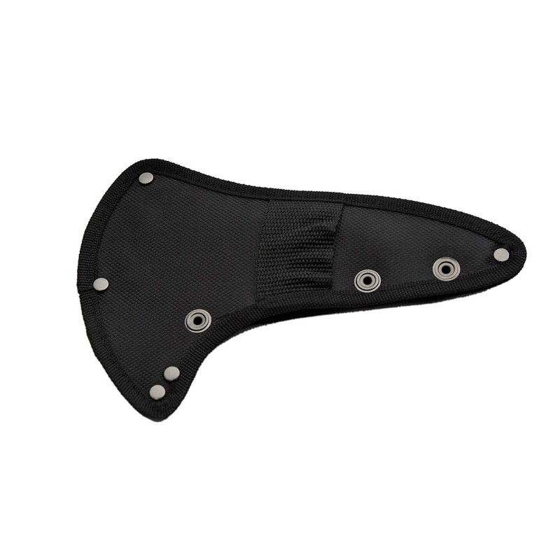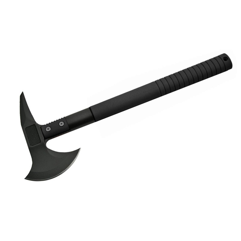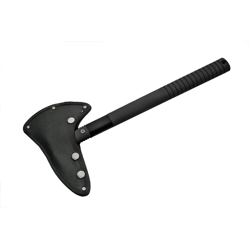 This black Fireman axe by SZCO Supplies is 17" in overall length with a 14.25" handle length. The handle color is black and has a black stainless steel blade. Comes with a sheath.