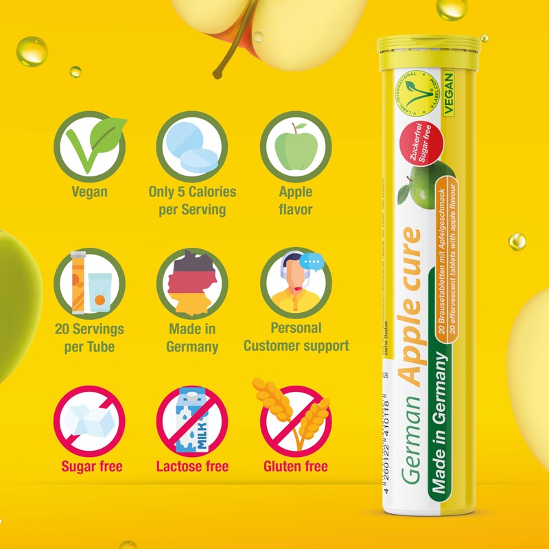 2 x 20 = 40 drink effervescent tablets each 4.5 g dietary supplement with apple cider vinegar extract and vitamin B6. With sweeteners. German Apple cure effervescent tablets are a combination of apple cider vinegar extract and vitamin B6 and are suitable for anyone who wants to support their body with vitamin B6 and appreciates apple cider vinegar. Apple cider vinegar is produced by first obtaining apple juice by squeezing apples and then fermenting it in several steps until it becomes apple cider vinegar. For German Apple cure, high-quality apple cider vinegar powder was used, which was produced using a drying process known as spray drying. This makes it possible to optimally process the apple cider vinegar in an effervescent tablet, as in German Apple Cure. Vitamin B6, also known as pyridoxine, is one of the water-soluble vitamins and is found in both plant and animal foods. It contributes to normal energy metabolism. It also contributes to normal protein metabolism, the normal functioning of the immune system and the normal formation of red blood cells. In addition, vitamin B6 contributes to normal psychological function and to the reduction of tiredness and fatigue. German Apple cure is easy and uncomplicated to use as an effervescent tablet and is optimally rounded off by the fresh taste of apple.