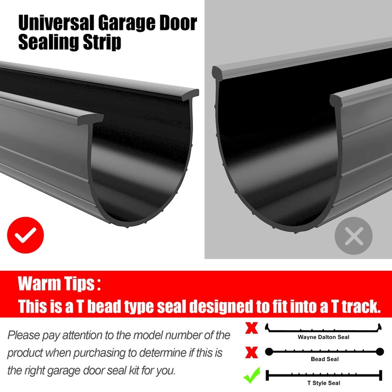 - 【Weatherproofing Garage Door Seals】 Garage Door Bottom Seal Replacement garage door weatherproofing sealing Weatherstrip, T-Ends: 0.31in, Width Flat:3.74 in, 16 Ft long,Length is 2” MINIMUM Longer than size ordered and easily cut to any length to fit the desired size of the garage door.This is a T type seal designed to fit into a T track,Fits MOST Garage Doors That Use a 1/4" or a 5/16" 'T' Channel Retainer.
