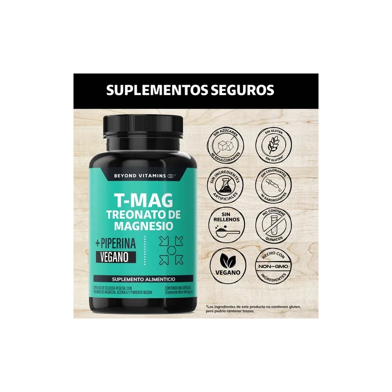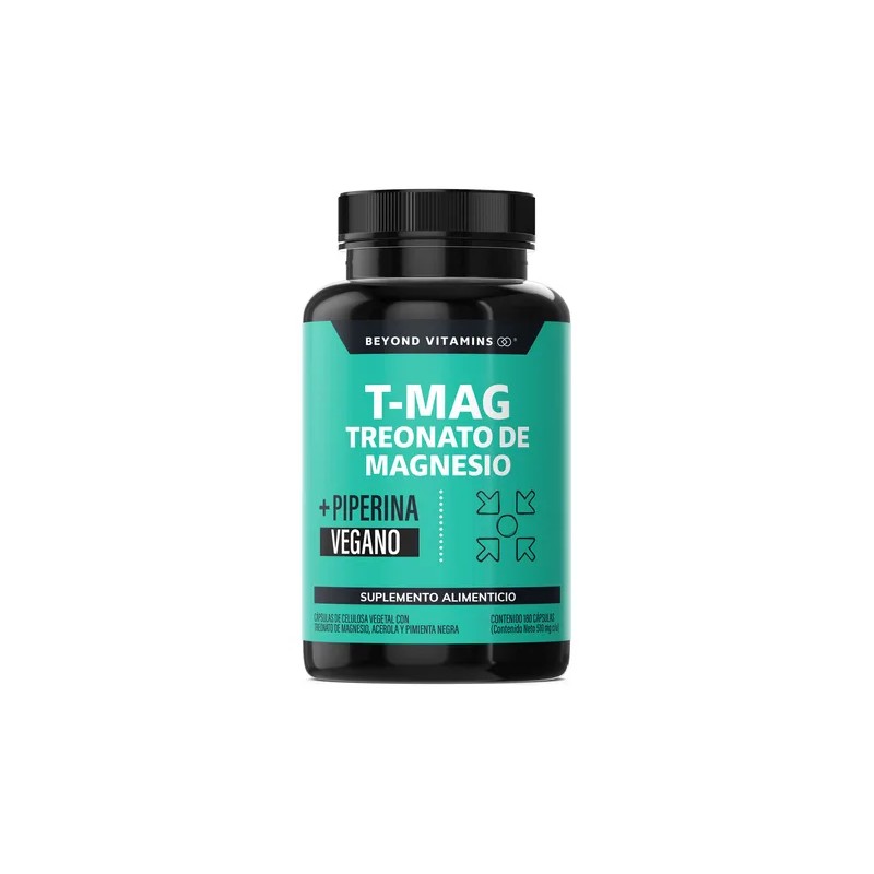 T-MAG L - Treonato Magnesio Beyond Vitamins contiene una combinación completa de L- Treonato Magnesio, Magnesio, Acerola y Pimienta Negra estandarizada al 95%.