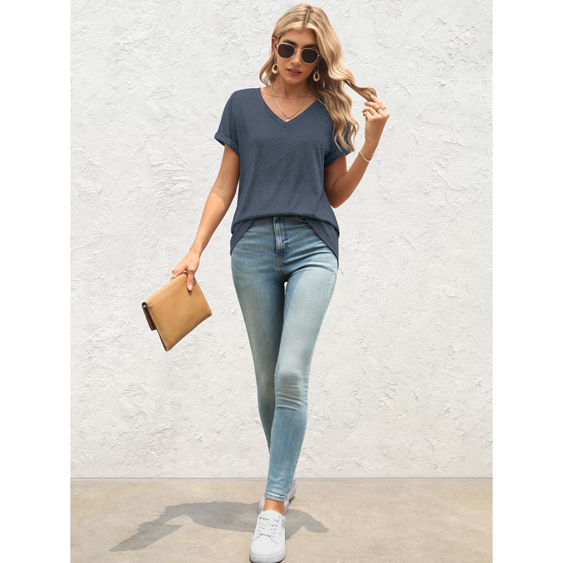T Shirts Short Sleeve V Neck Tees Womens Fashion Tops Loose Fit Lightweight Casual Summer Outfits Clothes 2025 Navy Beach