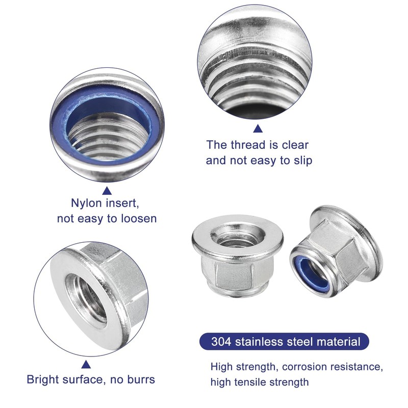 【Premium 304 Stainless Steel Construction】 - The secure nut is made of 304 stainless steel, which has high strength, corrosion resistance and high tensile strength. The insert is made of nylon, which is wear-resistant and impact-resistant. The combination of the two reduces vibration and looseness under torque.
