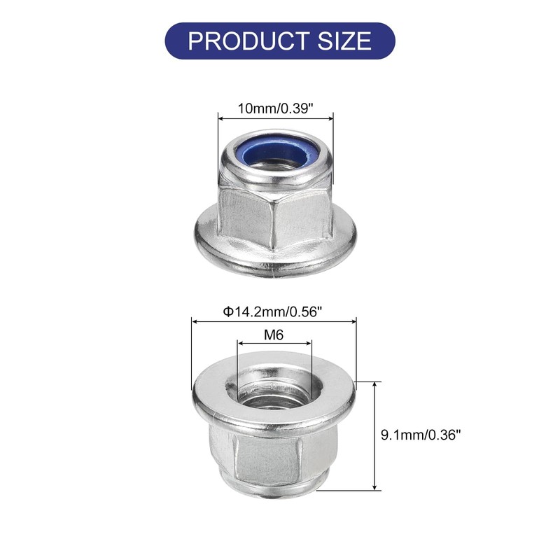 - 【Package contains】 - 15pcs x Nylon Lock Nylon Bolts Nuts; Thread Size: M6; Total Length: 9.1mm/0.36"; Thread Diameter: 6mm/0.24"; Flange Diameter: 14.2mm/0.56"; Pitch: 1mm/0.04"; Hex Width: 10mm/0.39".