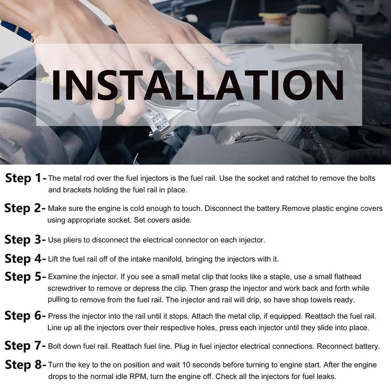 - Easy Installation- The plug-and-play design allows for quick and hassle-free installation. (Note: Fuel injectors directly affect the air/fuel ratio for the engine. (Pls check the other component of the engine before installation. Professional installation is recommended.)
