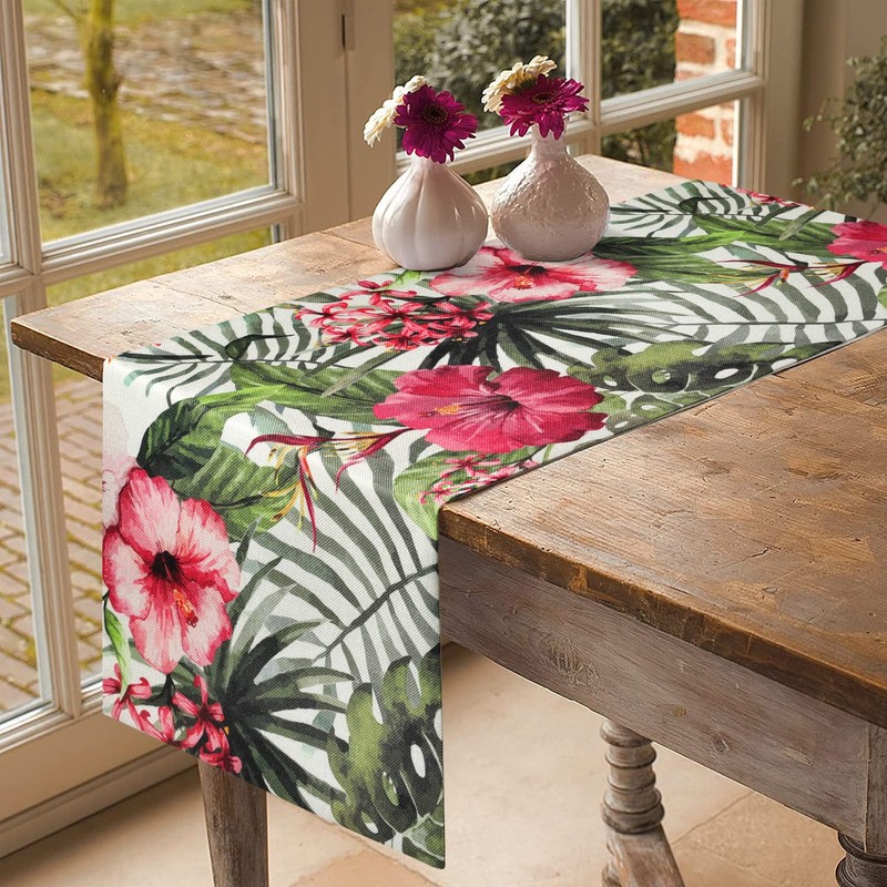 Table Runner Spring Green Leaf Table Runner Tropical Palm Pink Flowers Pattern Table Runner Dining Room Tablecloth Decoration for Kitchen Rectangular Decorative Table Runner Spring/Summer 40 x 140 cm