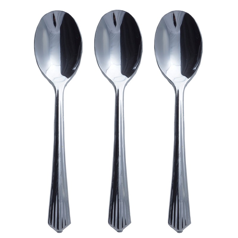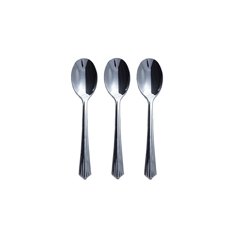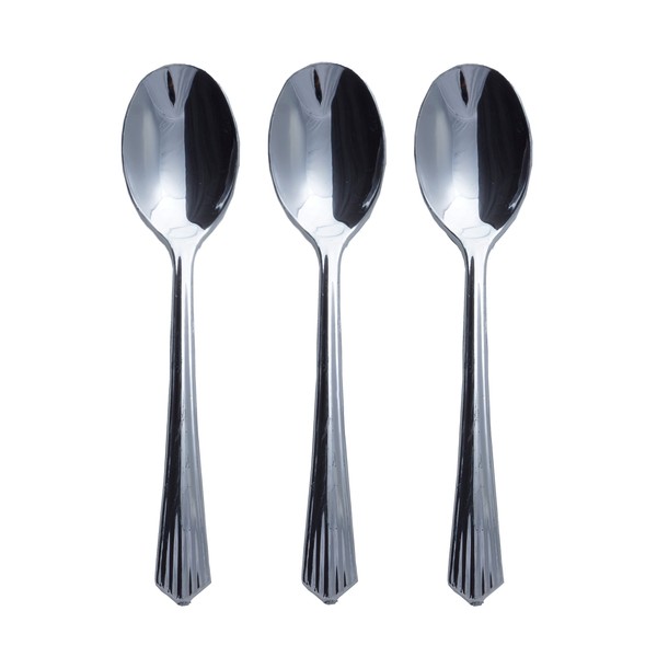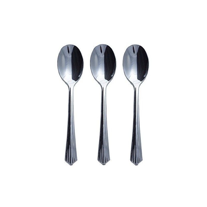 Create an elegant and sophisticated presentation at your upcoming special event or a festive meal with these classy disposable plastic coffee spoons. Our astounding Sorrentine Collection plastic spoons combine the convenience of plastic with the charismatic appeal of real silverware. The highly reflective,metallic look and a decorative handle coupled with fine silver finish makes these modern spoons appear highly elegant. With their swish shape and high quality plastic material, this disposable ware is sure to add a WOW factor to your tablescape. Your guests will hardly be able to differentiate between the plastic spoons and the real metallic ones due to their glistening sheen and glossy finish. With these beguiling spoons, make your cleanup time a cinch for any occasion. Whether its a jubilant birthday party or a festive wedding reception; these spoons are an ideal choice for coffee, tea, salads, cakes, cereals, side dishes, fruits, desserts, appetizers, and more. These disposable plastic coffee spoons are strong and sturdy, thus will avoid any spilling or leaking of food while eating. During exciting indoor events and summer fun activities, make dining and tidying a breeze with our special disposable plastic spoons. ;Additional Information:; Measurement: Approx 5" long x 1" wide;Quantity: 180 Silver Plastic Coffee Spoon per order;Material: Plastic;Note: This item is BPA Free;WARNING: Not Microwave or Dishwasher Safe