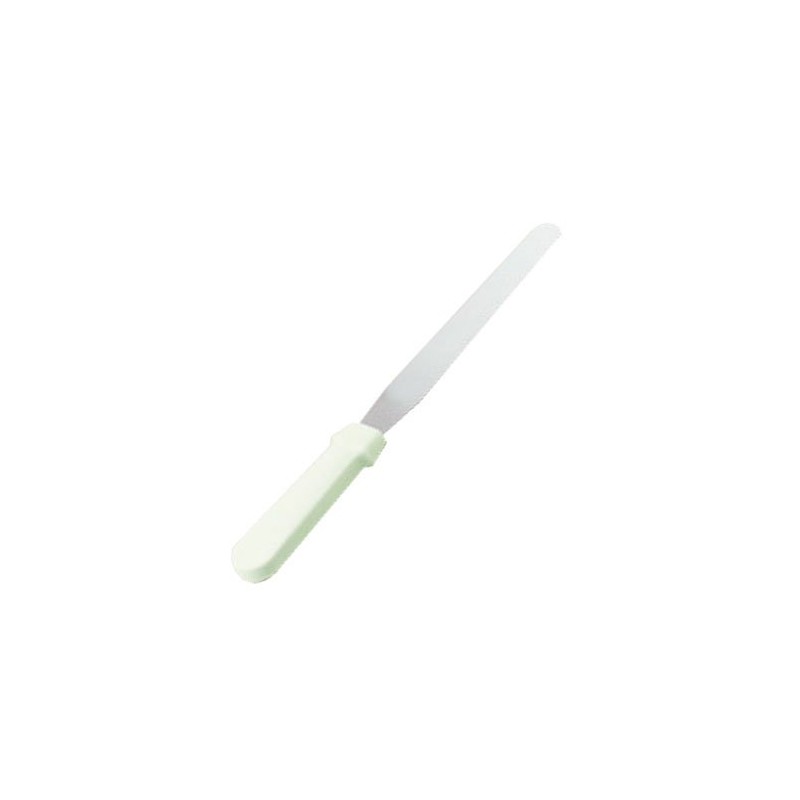 This icing spatula with ABS handle is used to ice cakes, scrape bowls and mix ingredients. Blade is made of stainless steel. The straight-blade spatula helps handle food effectively without sticking. Features durable plastic handle. Measures 8-inch length by 3/4-inch height by 1-2/7-inch width.