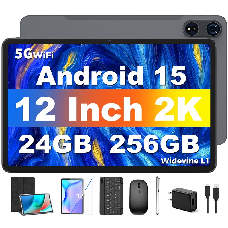 Tablet 12 inch Android 15 Tablets, 24GB(8+16)RAM+256 Storage(Expand to 1TB), Android Tablet with Keyboard, Octa-Core, 2K 2000x1200 Display, 16MP Dual Camera, 8000mAh, 5G WiFi,GPS,Bluetooth 5.0(Black)