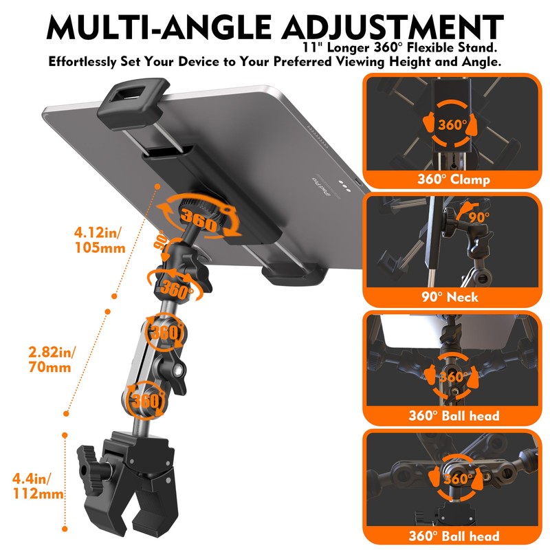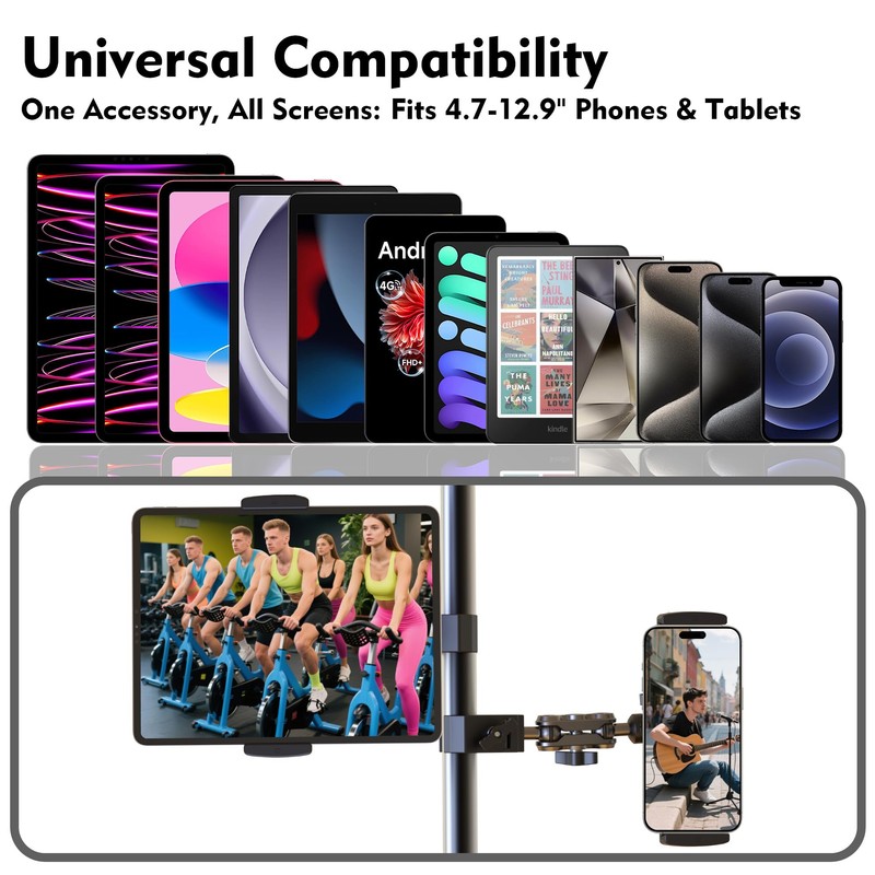 • Universal:The tablet clamp is stretchable and compatible with devices ranging from 4.7 to 12.9 inches.Such as iPad Pro 12.9, iPad Air, iPad, iPad mini, Samsung Galaxy Tabs, Surface,Surface Pro,Kindle Fire HD,drawing tablet.