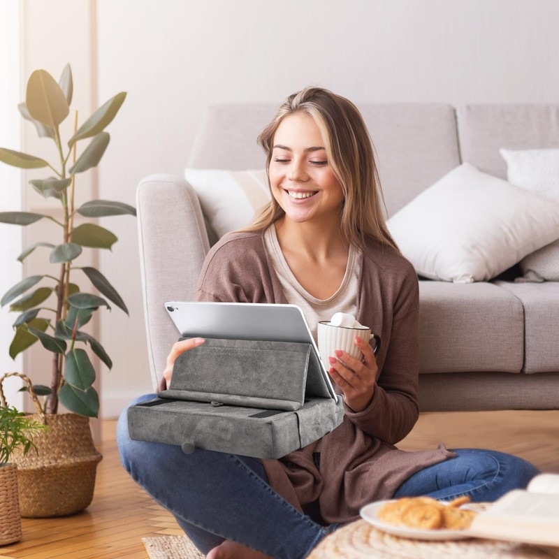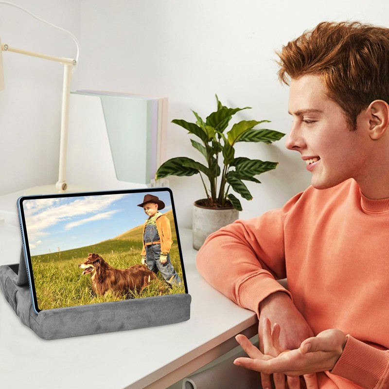 - 【💛Wide & Deep Grooves】The tablet pillow stand widens and deepens the fixing slot, it can fix your device well so it won't slide around. You can take it to your home, office, school, library, dormitory or wherever you need it. The surface is a very soft plush polyester that can be wiped with a damp cloth to keep the soft pillow tablet stand clean.
