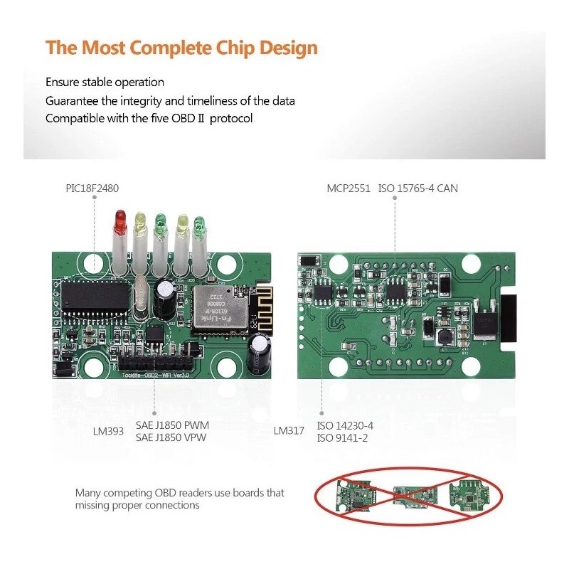※Unlike other cheap ones which adopt cloned chip called”V2.1”,which removes the chip LM339 and must lose connection on J1850 VPW,J1850 VPN,and J1850 PWM(mainly apply to many early cars,such as Ford before 2006,GM before 2008,Cadillac and Chevrolet before 2005,and other old Buick,Chrysler,Dodge,Isuzu,Lincoln,Mazda cars.)Some of “bad” clones can’t even connect to Nissan/Infinity/Datsun vehicles.However,we adopt ELM327 chip V1.5 of Microchip Technology in the U.S,supporting 9 complete OBD‖protocols.