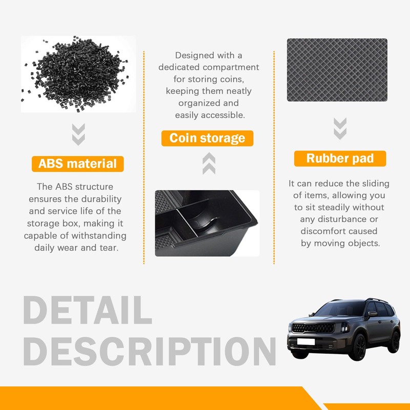- High-Quality, Durability: Constructed from premium ABS plastic, this organizer is built to last. It resists wear and tear while keeping its shape, even after daily use. The non-slip rubber pads inside the tray keep your items secure, reducing noise and preventing shifting during driving.
