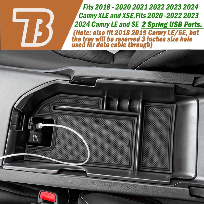 - OEM FIT: TACOBRO center console organizer Perfectly fits 2018 2019 2020 2021 2022 2023 2024 Camry XLE and XSE, 2020 2021 2022 2023 2024 Camry LE and SE, with 2 Spring USB Ports. (note: also fit 2018 2019 Camry LE/SE, but there will be reserved 3 inches size hole used for data cable through,Please consider whether you can accept this data cable hole position before purchasing)
