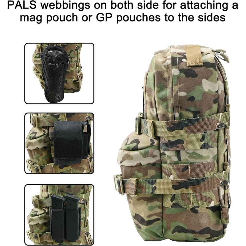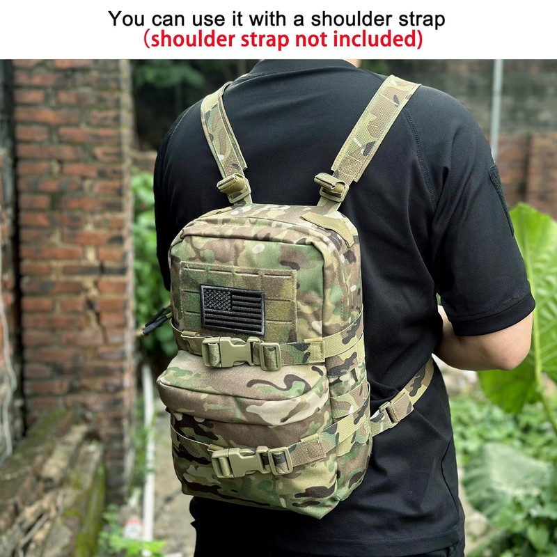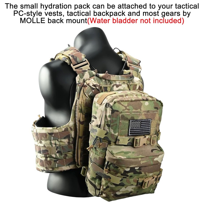 - [Molle Hydration Carrier]:The small hydration pack can be attached to your tactical PC-style vests, tactical backpack and most gears by MOLLE back mount,and PALS webbing on each side for attaching a radio pouch or GP pouches to the sides.This tactical hydration pack can accommodate 2L of water bladder(water bladder not included).Two hidden water hose outlet on the top is very convenient for your supply needs