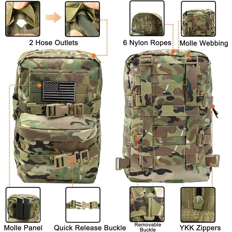 - Molle Hydration Carrier: The small hydration pack can be attached to your tactical PC-style vests, tactical backpack and most gears by MOLLE back mount,and PALS webbing on each side for attaching a radio pouch or pouches to the sides.This hydration bundle pack can accommodate 2L of water bladder(water bladder not included).Two hidden water hose outlet,which has stitched edge,on the top is very convenient for your supply needs.