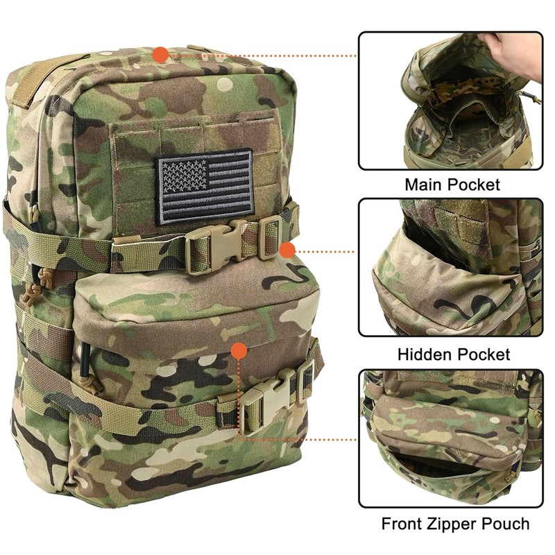 - Multi-purpose Hydration Backpack:This modular assault backpack is a multi-purpose hydration or assault pack with an internal hydration pocket,a main compartment,front zipper pouch and a extra room for additional inserts.And also you can use it as a independent back(have to buy a harness).