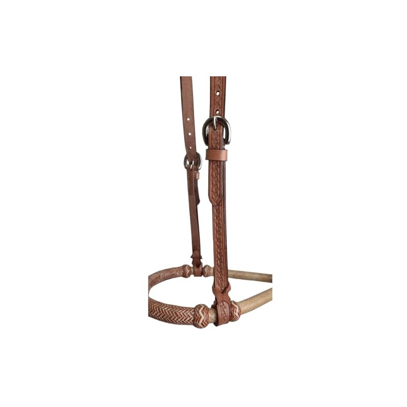 Tahoe 5/8" Rawhide Tan Bosal Mecate Set – Basket-Tooled Leather Hanger with 23 Ft Dark Brown Rope Mecate & Horsehair Tassel with 1-Year Warranty