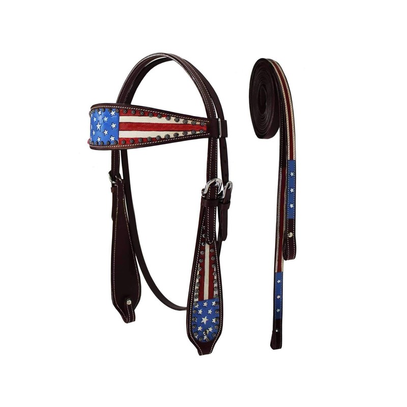 - PATRIOTIC DESIGN - this matching browband and rein set features a hand-painted American flag design in bold red, white, and blue and is perfect for shows or parades.