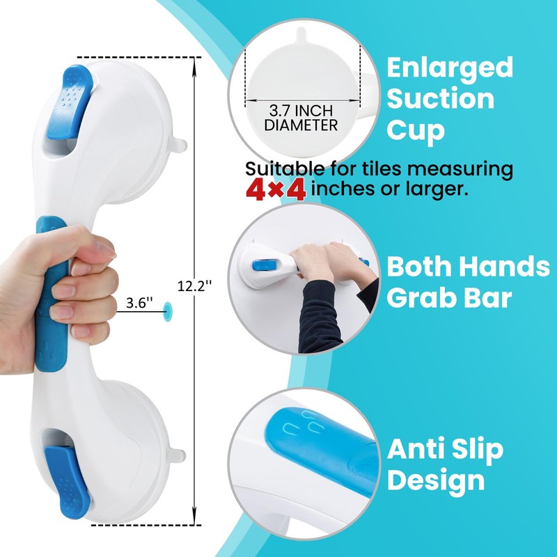 - Matters need Attention: For the safety of the seniors and elderly, please pay attention that the suction grab bars for shower ONLY sticks on smooth and non-porous AIRTIGHT walls which are NOT air-permeable like metal, glass, tile, marble, stainless steel and acrylic but does NOT apply on uneven tile, unfinished marble, wallpaper, dry wall, porous wall, etc. Please don't put all the body on the shower grip