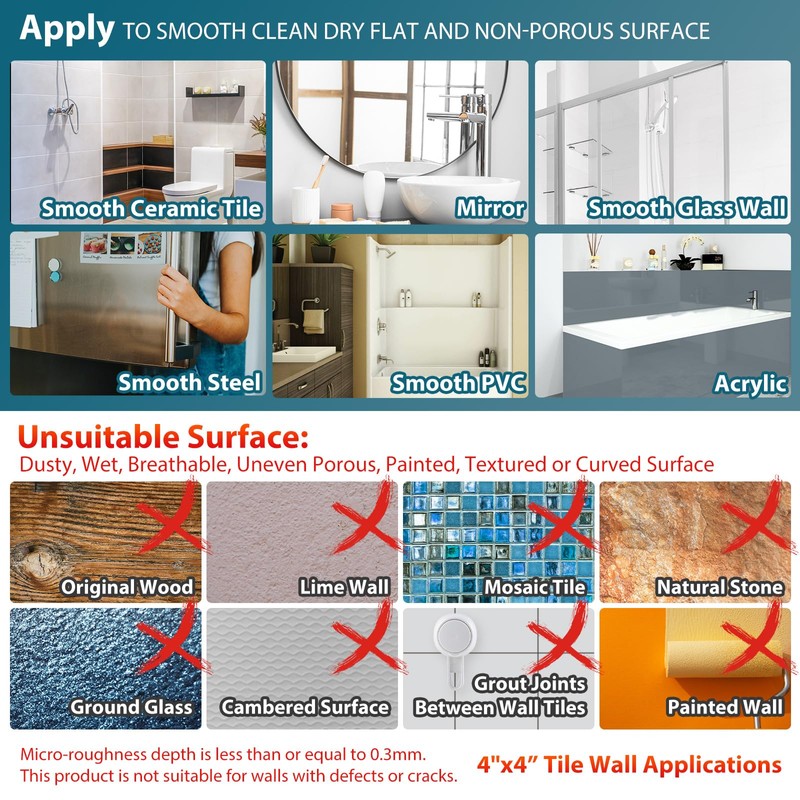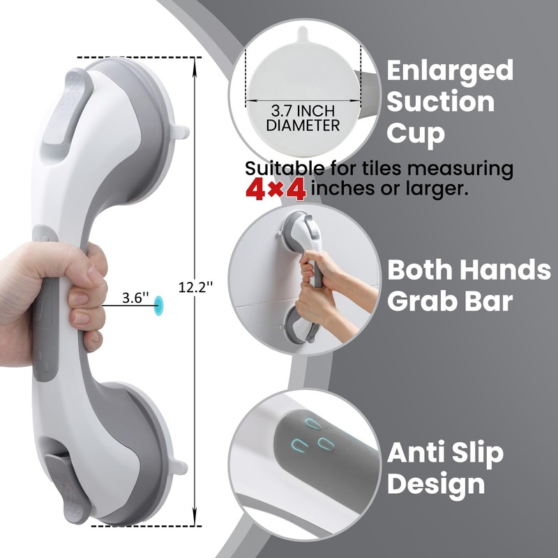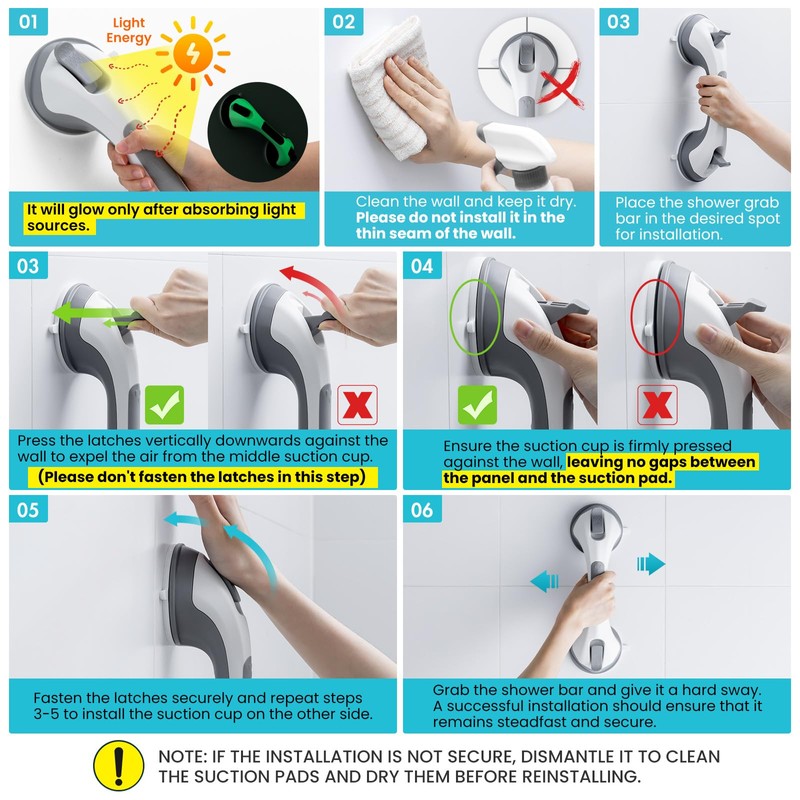 - Matters need Attention: For the safety of the seniors and elderly, please pay attention that the suction grab bars for shower ONLY sticks on smooth and non-porous AIRTIGHT walls which are NOT air-permeable like metal, glass, tile, marble, stainless steel and acrylic but does NOT apply on uneven tile, unfinished marble, wallpaper, dry wall, porous wall, etc. Please don't put all the body on the shower grip