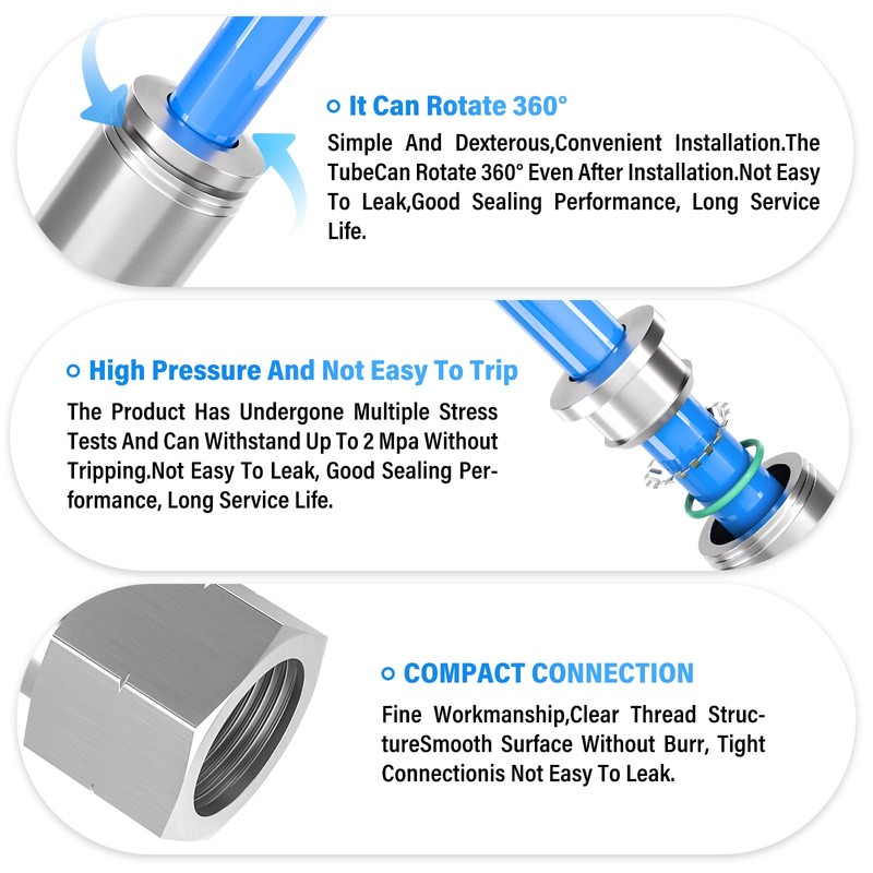 5. Do not use fittings under additional external stress (bending, turning or pulling), otherwise it will cause damage or leakage.